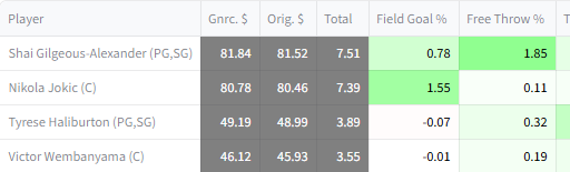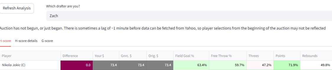 H-scoring is also run with with the updated context for the drafter in question. Those monetary estimates become 'Your $' after refinement through the auction value heuristic. The difference between 'Your $' and 'Gnrc. $' highlights players which are more or less valuable to the drafter in question than they are to a generic drafter.