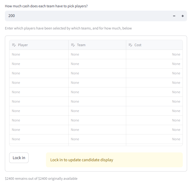 Player selection information can be entered into the editable table. Analysis will not begin until the 'Lock in' button is pressed; this is to allow for multiple updates without running H-scoring every time.