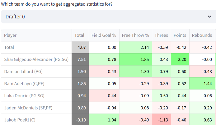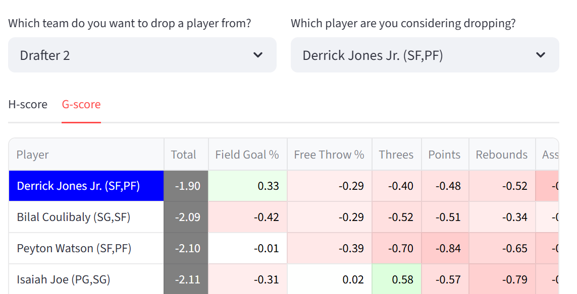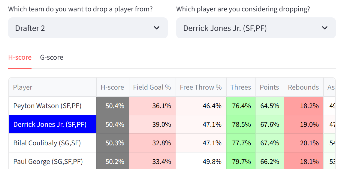 The player who is a candidate to be dropped is removed from the team, and H-scores are calculated for all available players plus the drop candidate. The drop candidate is highlighted in blue. Players who do not fit the position structure of the team are filtered out and their H-scores are not shown.