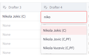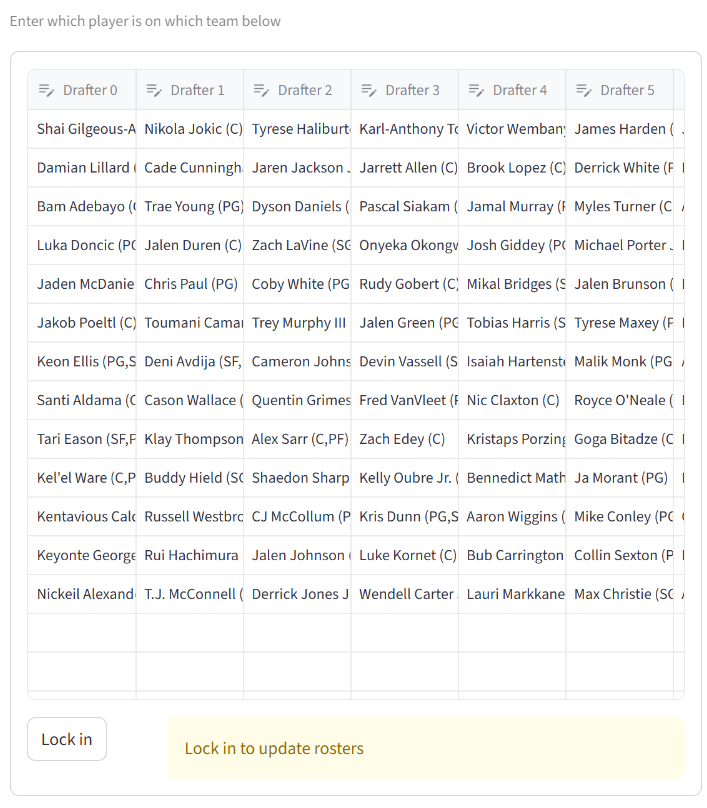 Generally draft results can be copy-pasted from the drafting view into an Excel and then into this table, so long as the dataset of valid players remains the same. Occasionally there are bugs with copy-pasting into the rosters table, such as the first column not being copied over. In that case, the few remaining players can be entered by hand.