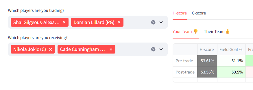 The trading tab analyzes the H-score and G-score implications of potential trades. It also provides recommendations for trades.